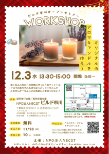 12月3日(水)、ビルド市川にてワークショップ「オリジナルのアロマキャンドルを作ろう」を実施いたします。