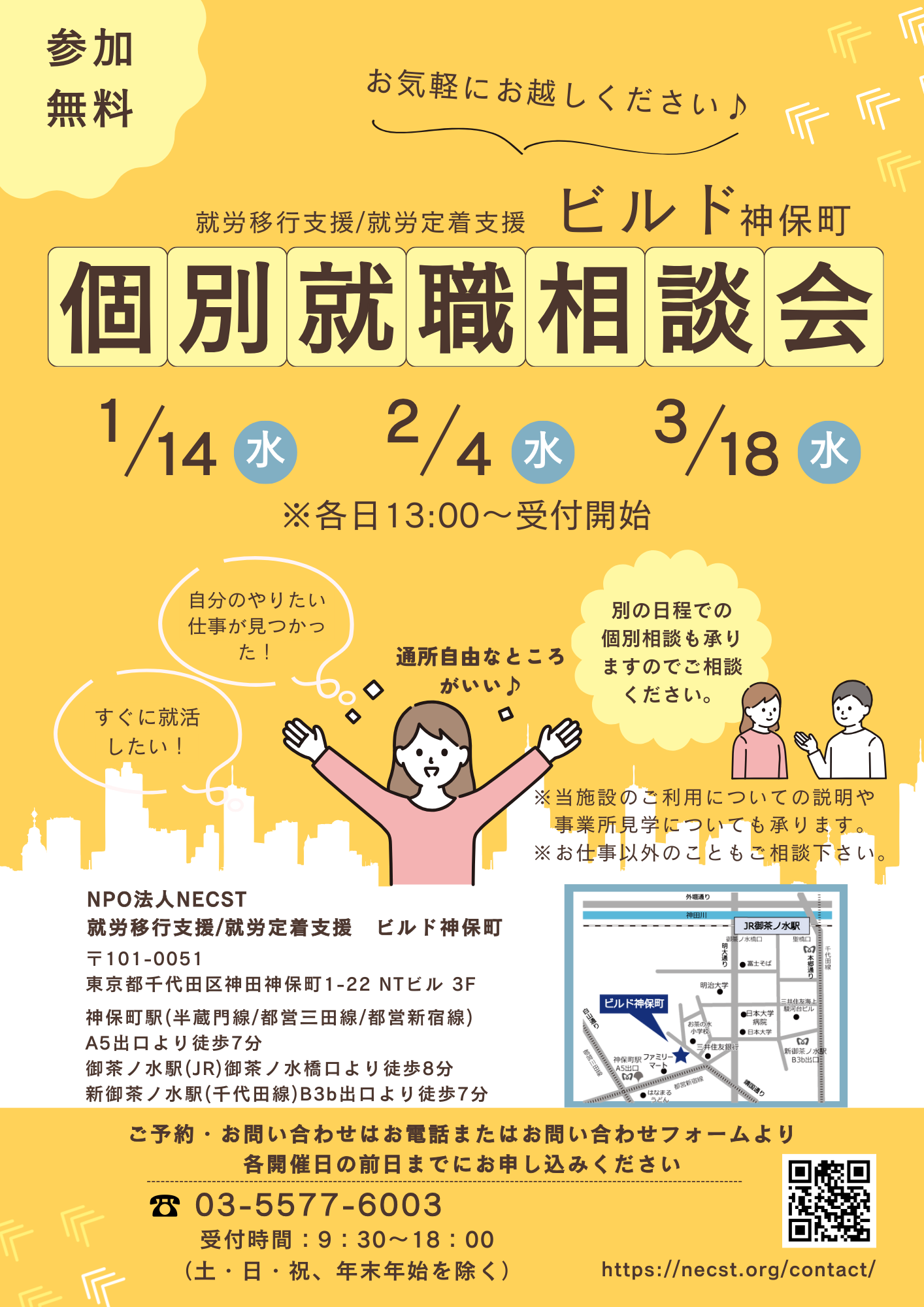 | ご予約・お問い合わせ: | NPO法人NECST ユースキャリアセンターフラッグ TEL:047-711-3368 |