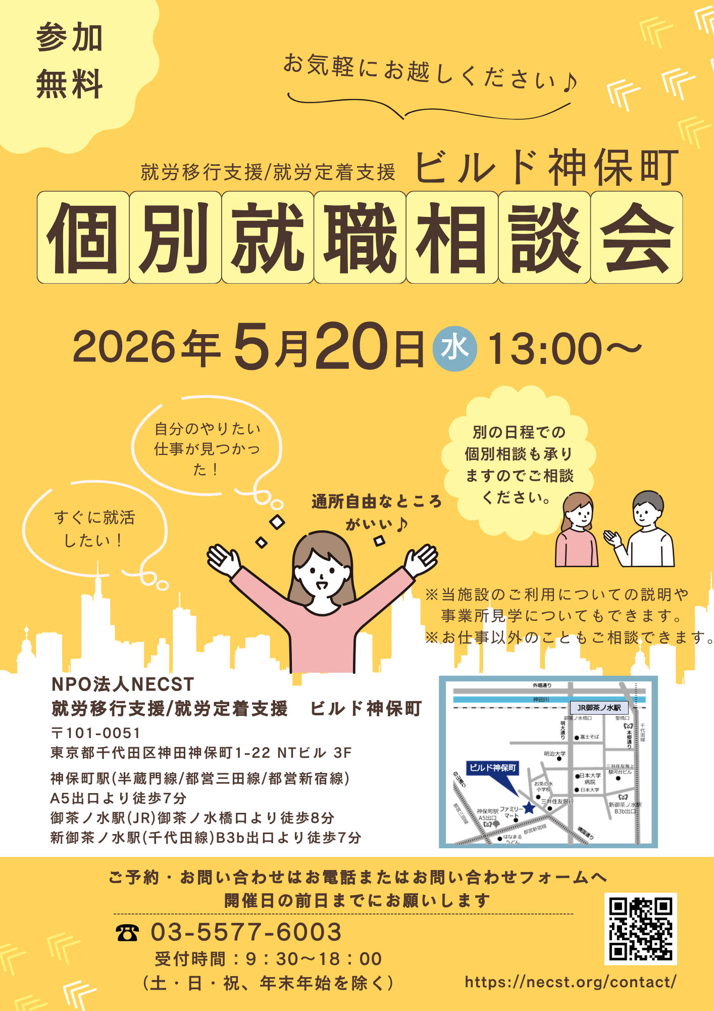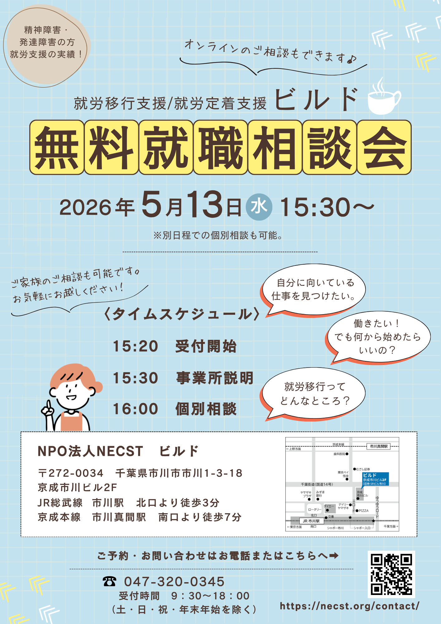 | ご予約・お問い合わせ: | NPO法人NECST 就労移行支援事業所ビルド市川 TEL:047-320-0345 |